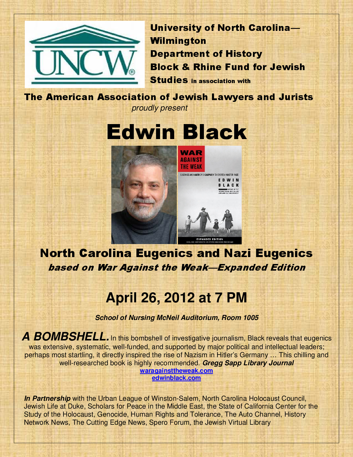 Department of History and Block & Rhine Fund for Jewish Studies in association with the Urban League of Winston-Salem, North Carolina Holocaust Council, the American Association of Jewish Lawyers and Jurists, Jewish Life at Duke, Scholars for Peace in the Middle East, the State of California Center for the Study of the Holocaust, Genocide, Human Rights and Tolerance, The Auto Channel, History Network News, The Cutting Edge News, Spero Forum, the Jewish Virtual Library, and a coalition of partners now being assembled.