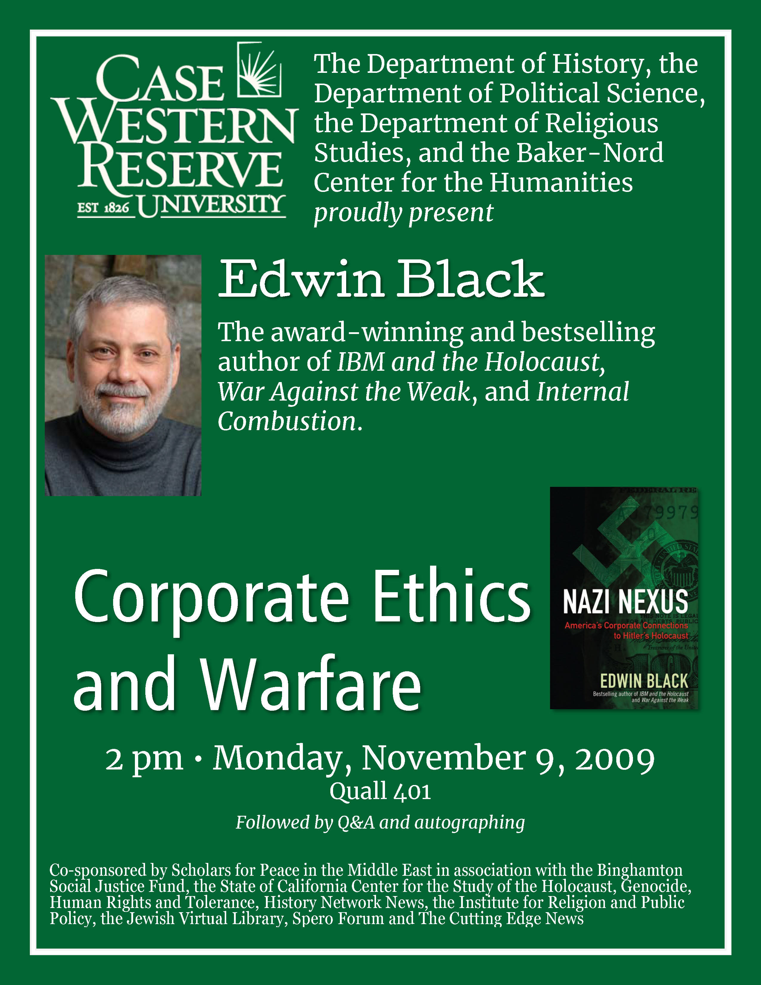 Sponsored by the Case Western Reserve Department of History, Department of Political Science, Department of Religious Studies, and the Baker-Nord Center for the Humanities; co-sponsored by Scholars for Peace in the Middle East in association with the State of California Center for the Study of the Holocaust, Genocide, Human Rights and Tolerance, the Binghamton Social Justice Fund, History Network News, the Institute for Religion and Public Policy, the Jewish Virtual Library, The Auto Channel, Spero Forum, and The Cutting Edge News.