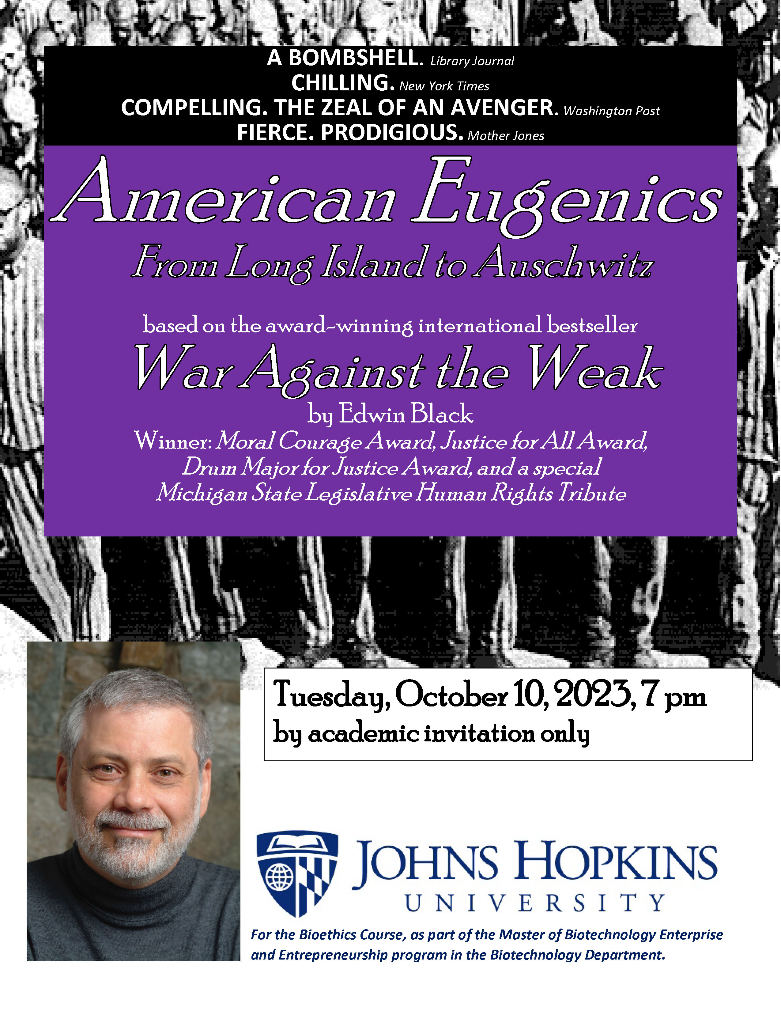 Edwin Black returns to Johns Hopkins University to present American Eugenics: From Long Island to Auschwitz, based on his award-winning War Against the Weak. By academic invitation only, for the Biotechnology Department’s Bioethics Course, part of the Master of Biotechnology Enterprise and Entrepreneurship Program.
