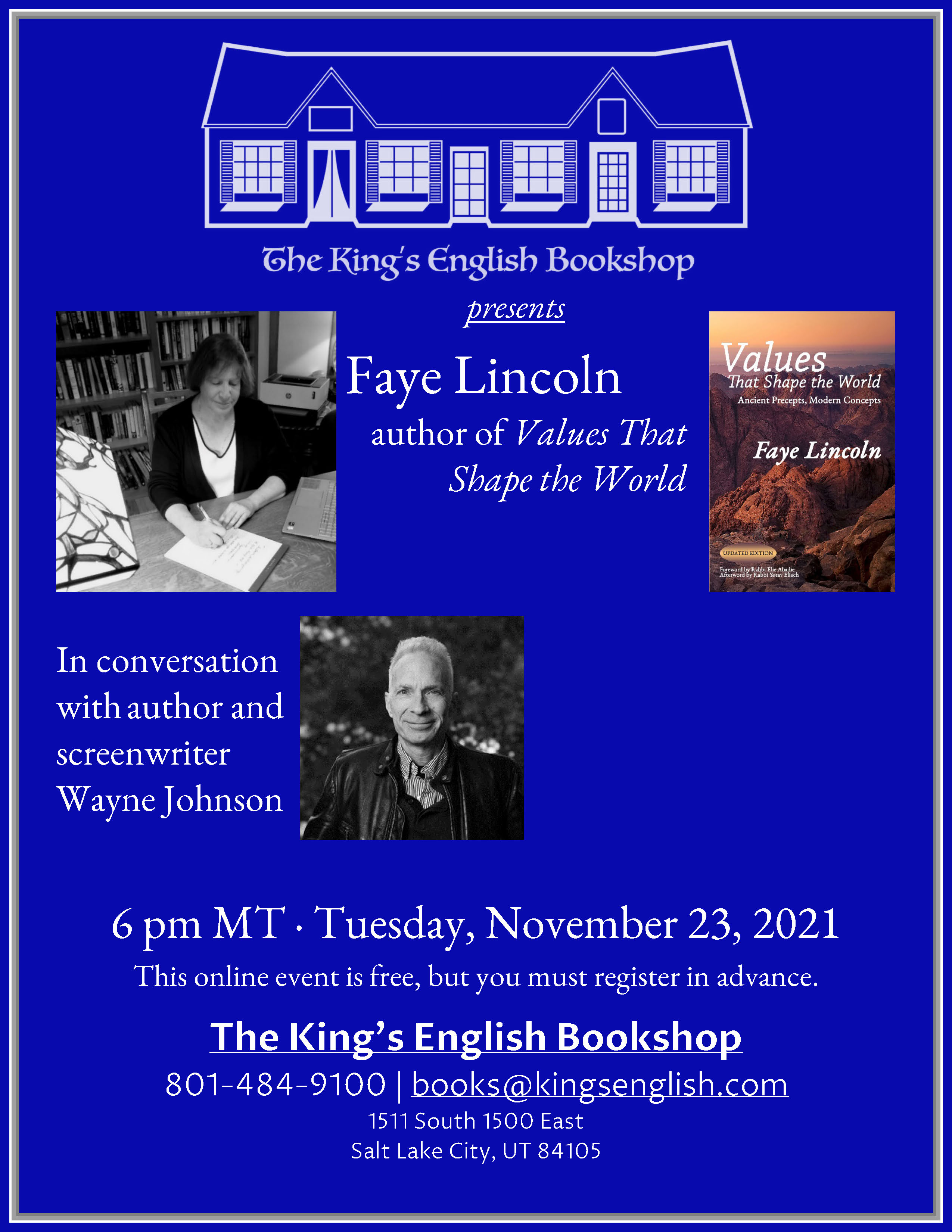 The King’s English Bookshop presents Faye Lincoln, author of Values That Shape the World: Ancient Precepts, Modern Concepts, in conversation with author and screenwriter Wayne Johnson.
