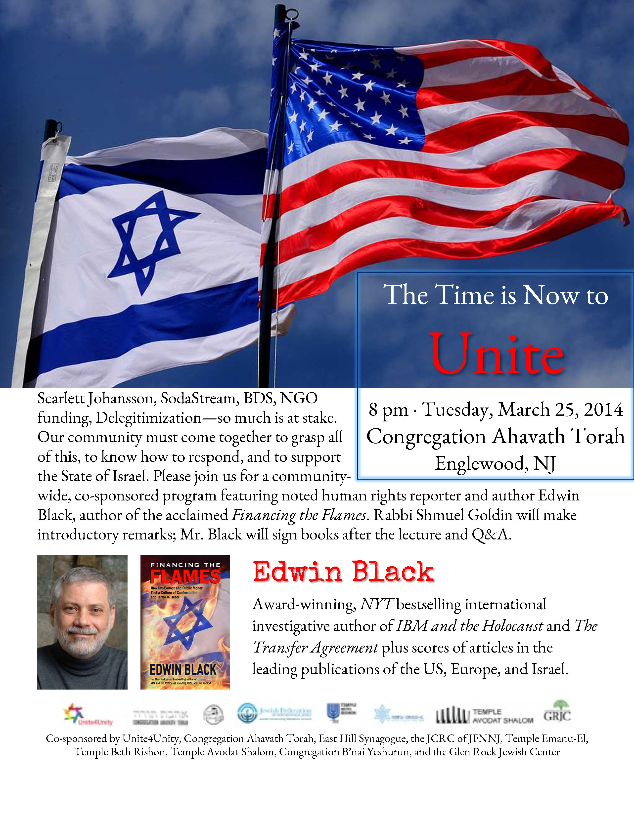 A community-wide program with numerous sponsors including Unite4Unity, Congregation Ahavath Torah, East Hill Synagogue, Temple Emanu-El, Temple Rishon, Temple Avodat Shalom, Congregation B'nai Yeshurun, the Glen Rock Jewish Center, the Jewish Federation of Northern New Jersey, and the Jewish Community Relations Council of the Jewish Federation of Northern New Jersey. Co-sponsored by the American Association Of Jewish Lawyers and Jurists, Institute for the Study of Global Antisemitism and Policy, One Israel Fund, and the Jewish Virtual Library.