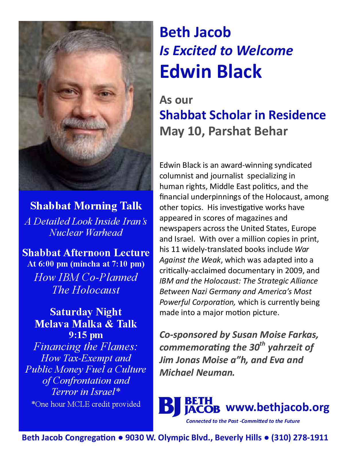 Special Cosponsors: Susan Moise Farkas commemorating the 30th yarhzeit of Jim Jonas Moise, and Eva and Michael Neuman.