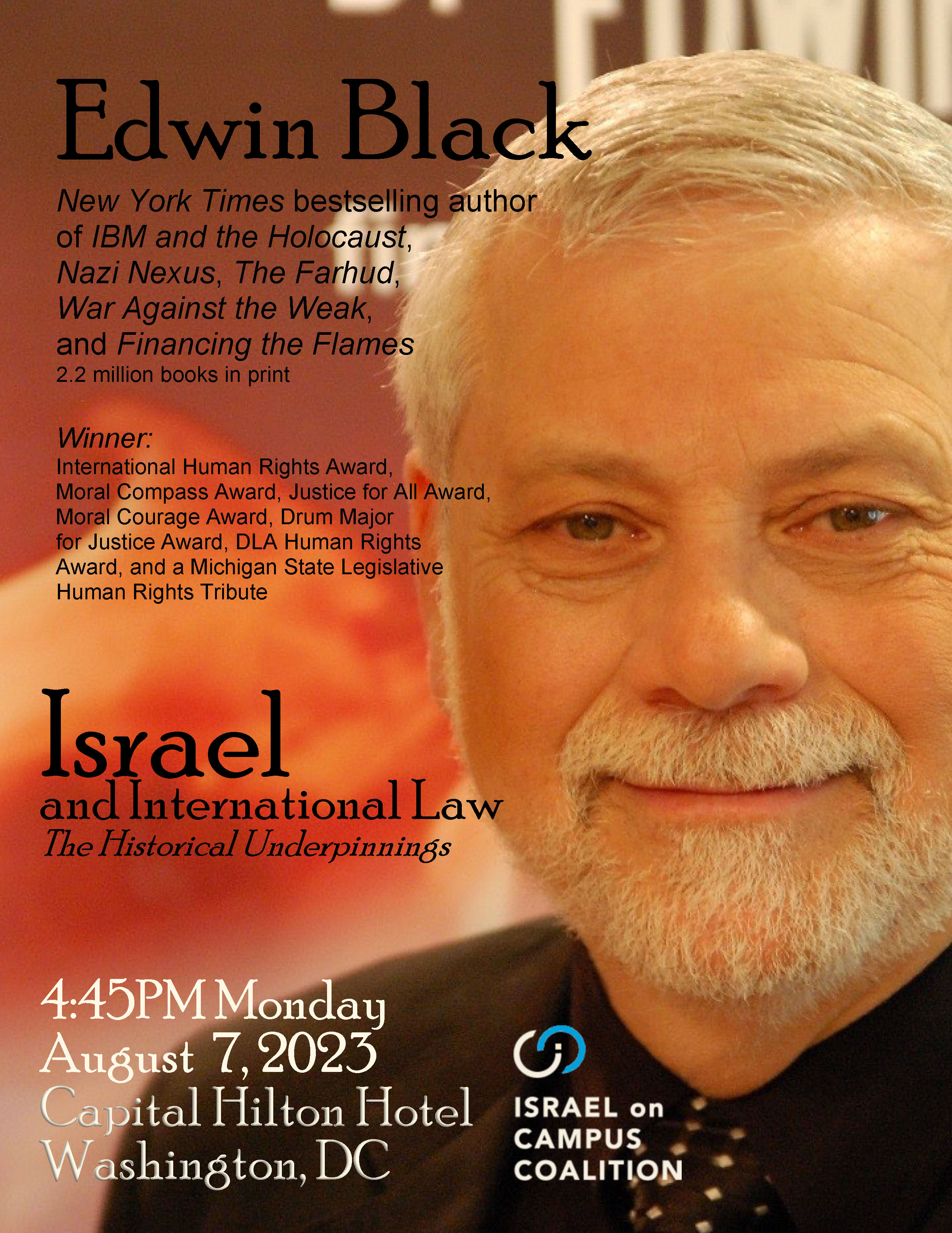 Edwin Black traces the historical underpinnings of Israel and International Law, a deep dive that will completely reshape and revitalize one's understanding of Israel, the Mideast, the Arab-Israel conflict, and how international law does or does not intersect. This one presentation will change everything, and empower everyone who cares about Israel.